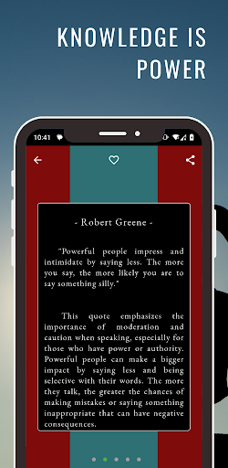 Unlock your true potential as a leader and influencer with "48 Laws of Power Daily Quotes." Start your journey of self-discovery and personal growth today. Dive into the wisdom of the ages, reflect on your actions, and embrace the power within you. Whether you're a business professional, student, or aspiring leader, this app is a powerful tool to enrich your understanding of power dynamics and leadership principles.