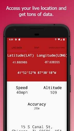 Access your location results including your coordinates, accuracy, altitude, address, and speed.