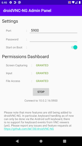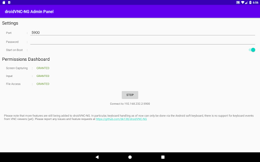 Please note that more features are still being added to droidVNC-NG. In particular, most keyboard strokes as of now can only be input via the Android soft keyboard, there is only limited support for keyboard events from VNC viewers (yet). Please report any issues and feature requests at https://github.com/bk138/droidVNC-NG