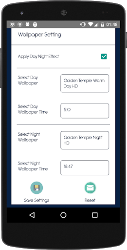 -Most important- Day and Night Effect.:Wallpaper would change automatically during day and night. according to the time given in settings screen