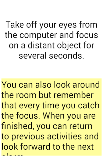 Do you spend a lot of time looking at a computer monitor? Do you afraid about your eyes? If it is true, this application is for you! The most important thing is to take a break for your eyes and this app will help you. Set alarm and follow the instruction. The application will remind you to take a break for your eyes.
