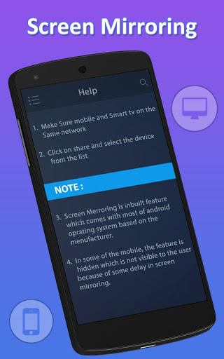App will assist you to scan and mirror your android phone or tab's screen on smart TV/Display or Wireless dongles or adapters. Screen Mirroring Able to play videos, music, photos, etc in my Smartphone with any devices like smartphone, smart TV, laptop, tablet, etc at anywhere.