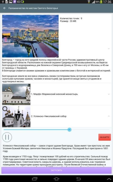 تم تصميم التطبيق لمساعدة الحجاج على قراءة الطرق للأماكن المقدسة الأرثوذكسية ويمر من خلالهم.