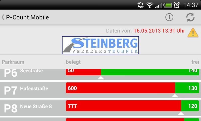التطبيق هو عالمي، يتم اعتماد البيانات الإشغال من مواقف السيارات والمرائب وقوف الفائدة من نظم الحصول على البيانات وقوف السيارات على حد سواء في المناطق الحضرية والمحلية. قائمة أنظمة اكتساب بارك، انظر www.steinberg-traffic.com/p-count-mobile. عرض الاحالة من السهل قراءة باعتبارها بار الأحمر والأخضر وعدديا.