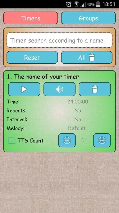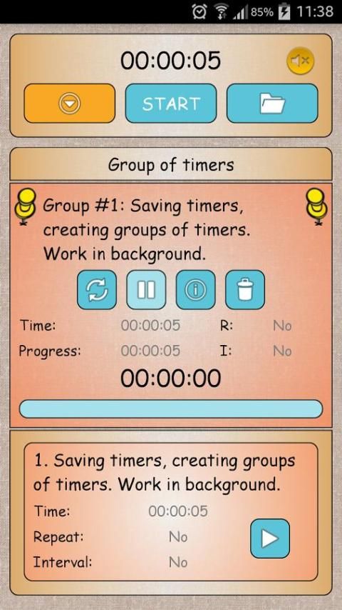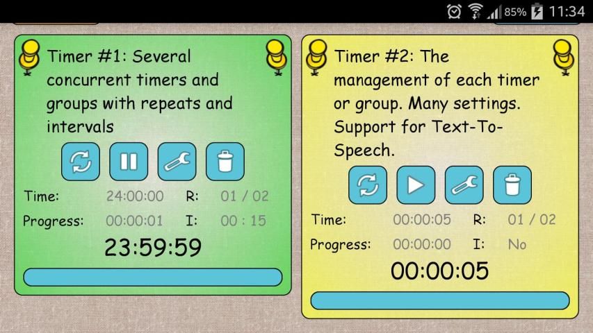 أي وقت من الأوقات أو غير مريحة للنظر في شاشة الجهاز؟ يجب أن لا تأخذ هذه المشكلة لأن التطبيق يدعم خطاب التكنولوجيا التوليف "تحويل النص إلى كلام" (TTS) **، وهو ما يعني أنه لا يمكن أن يصرف عن طريق الهاتف الذكي أو الكمبيوتر اللوحي، وسيتم الإعلان عن جميع المعلومات اللازمة عن حالة الموقت. مع وظيفة "عدد TTS" *** يمكن توليفها أرقام التسلسل (1، 2، 3، الخ) بعد انتهاء وقت معين. إذا كنت غير قادر على استخدام التكنولوجيا تحويل النص إلى كلام، كنت لا تزال لن يغيب عن بداية يكرر المقبل أو الموقت المقبل. أعرب عبارات احترازية أصوات مذيع. الموقت يمكن تشغيل في الخلفية، مما يزيد من وقت التشغيل من البطارية.
