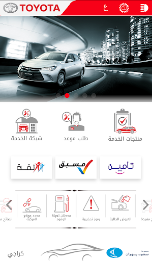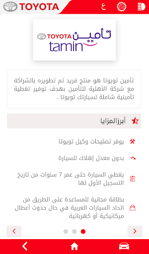 الرموز التحذيرية: توفِّر معلومات حول الرموز التحذيرية التي تظهر في لوحة العدادات داخل سيارة تويوتا، كما أنها ترشد الزبون حول الإجراء المناسب الذي يجب عليه القيام به حال ظهور تلك الرموز أثناء القيادة. وفضلاً عن ذلك هناك أيضًا العروض الحالية ، نصائح مفيدة ، وخاصية تحديد مكان السيارة والتي تتيح للزبون تحديد المكان الذي قام بركن سيارته فيه. وهناك أيضًا ميزة محدد مكان محطة تعبئة الوقود والتي يمكن للزبائن استخدامها والاستفادة منها.