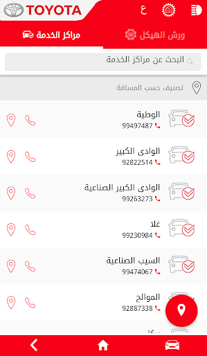 شبكة خدمة تويوتا : توِّفر معلومات عن فروع تويوتا فضلاً عن معلومات الاتصال وخط المساعدة والتواصل على مدار الساعة طوال أيام الأسبوع ، وكذلك معرفة مسؤول الفرع وعناوين البريد الإلكترونية الخاصة بكل فرع وغيرها. ومن شأن ذلك المساعدة في معرفة مكان مركز خدمة تويوتا وكيفية الاتصال به ، بما في ذلك ورش الصبغ والهيكل. وعند القيام بتفعيل GPRS، سيقدم التطبيق أيضًا المساعدة للزبائن عبر توضيح أقرب المسارات للوصول إلى فرع الخدمة المطلوب.