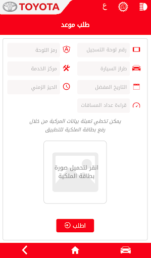 طلب حجز موعد لإجراء الخدمة: يمكن للزبون التقدم بطلب لحجز موعد لإجراء الخدمة لسيارته تويوتا في أي من فروع خدمة تويوتا حسب التاريخ والموعد المفضل لديه ، وسيصله تأكيد بهذا الحجز.