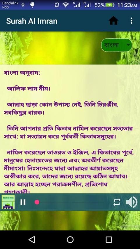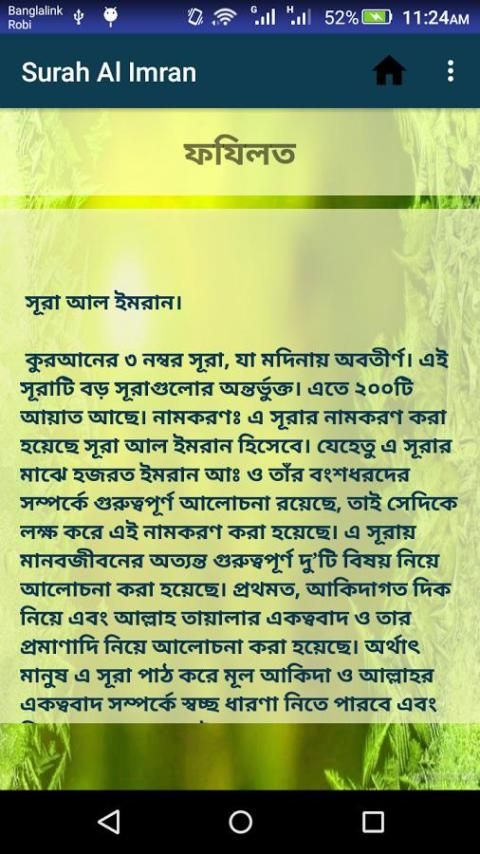 পবিত্র কোরআন শরীফের একটি তাৎপর্যপূর্ণ সূরা হল সূরা আল-ইমরান. মাত্র কিছু সময় ব্যয় করে এর তেলাওয়াত ও অর্থ শুনতে পারবেন আমাদের এপসটিতে. কোন রকম ইন্টারনেট সংযোগ এর প্রয়োজন নেই সূরাটি শোনার জন্য.