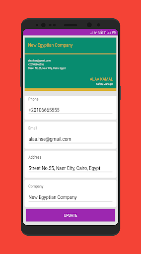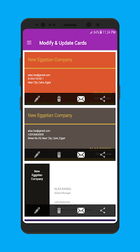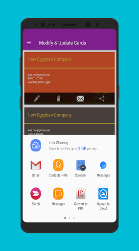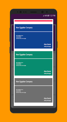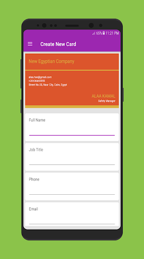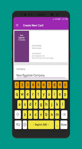 4.إنشاء بطاقات العمل عن طريق ملء اسمك والشركة والموضع والبريد الإلكتروني ورقم الهاتف والعنوان.