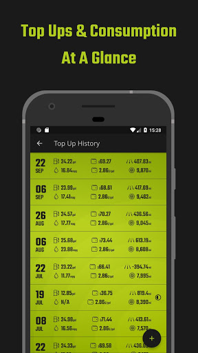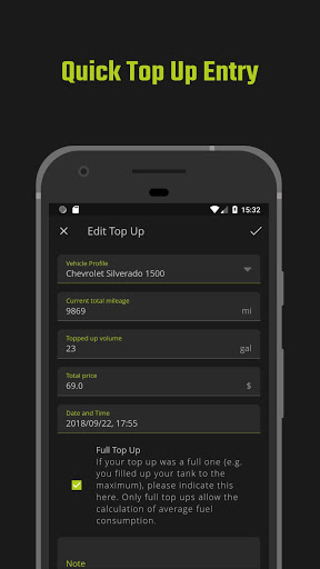 - শীর্ষস্থানীয় রয়েছে: মাইলেজ, ভলিউম, মূল্য, তারিখ এবং সময়, নোট এবং এটি একটি সম্পূর্ণ বা আংশিক শীর্ষ আপ হয়েছে কিনা