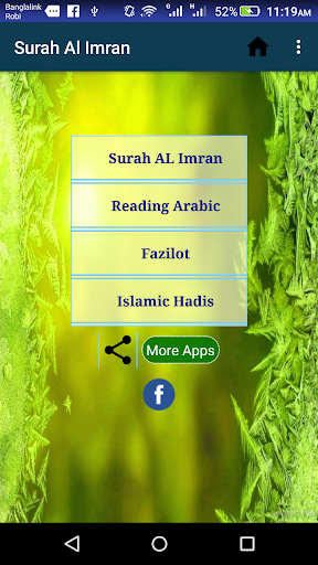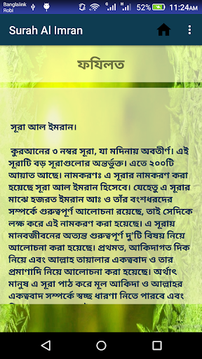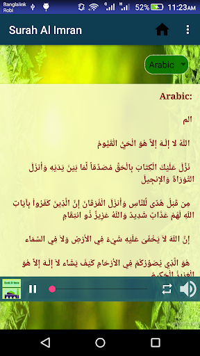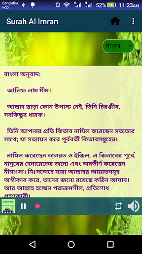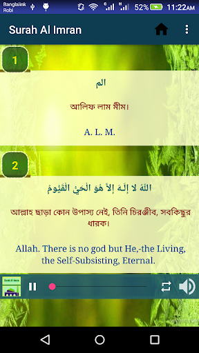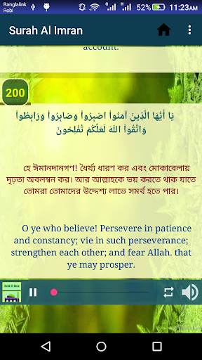 সূরা আল-ইমরান হল পবিত্র কোরআন শরীফের একটি তাৎপর্যপূর্ণ সূরা। মাত্র কিছু সময় ব্যয় করে এর তেলাওয়াত ও অর্থ শুনতে পারবেন আমাদের এপসটিতে। কোন রকম ইন্টারনেট সংযোগ এর প্রয়োজন নেই সূরাটি শোনার জন্য।