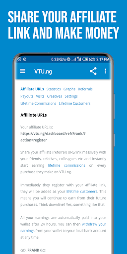 অ্যাফিলিয়েট (অর্থ উপার্জন করুন): আমাদের বৃহদায়তন জীবনকাল কমিশন উপভোগ করুন (এয়ারটাইম: 0.05%; তথ্য: ₦ 10; কেবল টিভি: ₦ 10; বিদ্যুৎ: ₦ 15) একজন অনুমোদিত হিসাবে এবং আমাদের সাথে অর্থ উপার্জন করুন।