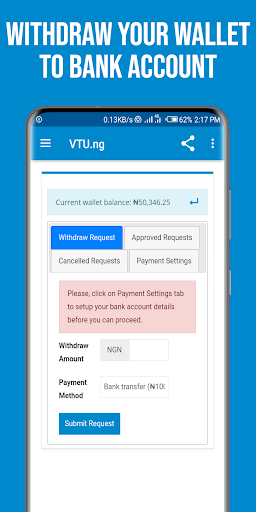 : আমরা আপনার ব্যাংক অ্যাকাউন্টে 15 মিনিটের Wallet প্রত্যাহার প্রদান করি। আপনি যে কোন সময় আপনার ওয়ালেট ভারসাম্য প্রত্যাহার করতে পারেন। এটি নগদ, ওয়ালেট টপআপ বা রেফারেলের জন্য এয়ারটাইমের মাধ্যমে তৈরি অর্থ হতে পারে।