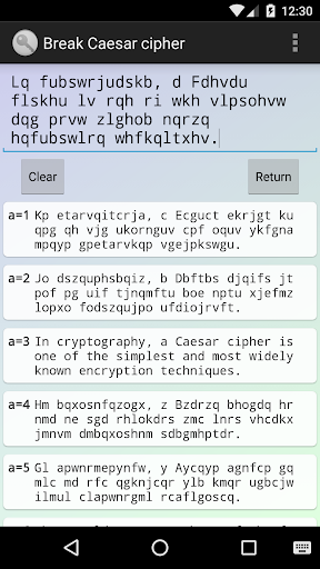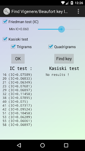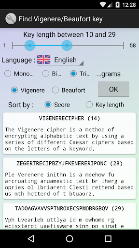 - Verallgemeinerte Vigenère-Chiffre. Es ist möglich, Ver- und Entschlüsselungstafeln im CSV-Format oder Schlüsselwörter zu einer Textdatei (geschützt durch einen Vigenère-Schlüssel) im Ordner "CESAR" des Gerätespeichers zu speichern oder von dort wieder in das Programm zu laden. Jede denkbare Schlüsseltafel (der Größe 26x26) kann vom Nutzer erstellt werden. (5,6*10^691 Möglichkeiten !)