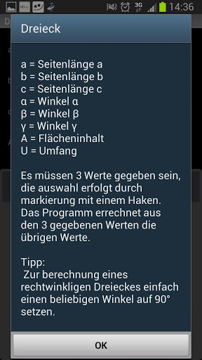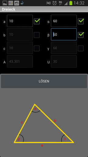 z.B. die Seitenlängen eines Dreieckes. Die App kann jetzt die übrigen Werte wie Flächeninhalt und Umfang sowie die Winkel des Dreiecks berechnen.