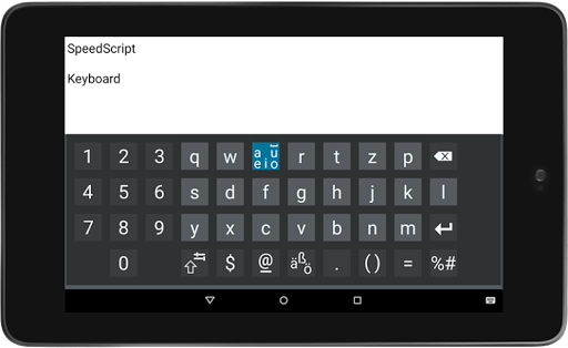 SpeedScript benutzt ein QWERTZ-Layout ohne Vokaltasten. Auf der Standard-QWERTZ-Tastatur liegen die meisten Vokale am Rand. Davon profitiert SpeedScript, wenn es die QWERTZ-Tastatur komprimiert, ohne das vertraute Layout zu verlieren. Die verbleibenden Tasten liegen beinahe auf den identischen Positionen im Verhältnis zueinander.