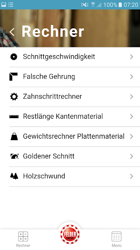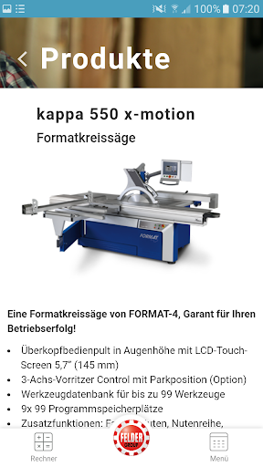 In der App der FELDER GRUPPE finden Sie alle Holzbearbeitungsmaschinen der Marken FELDER, FORMAT-4 und Hammer sowie eine hilfreiche Toolbox mit nützlichen Werkzeugen für perfekte Holzbearbeitung (z.B. Rechner für Schnittgeschwindigkeit, Falsche Gehrung, Restlänge Kantenmaterial, Gewicht Plattenmaterial, Goldener Schnitt, Holzschwund und Zahnschritte, außerdem einen QR-Scanner, die Möglichkeit direkten Kontakt zum Felder Gruppe Kundendienst aufzunehmen und vieles mehr).