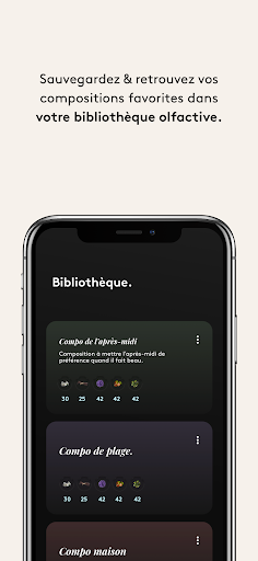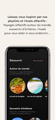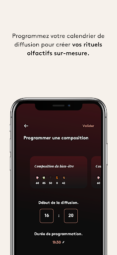 Programmieren Sie aus der mobilen Anwendung Ihren Diffusionskalender, um Ihre maßgeschneiderten olfaktorischen Rituale zu erstellen: Wählen Sie den Tag, die Zeit- und Zeitdiffusion und lassen Sie den Komponisten den Rest besetzen.Auf Urlaub?Sie können Ihren Kalender pausieren und ihn bei Ihrer Rückkehr reaktivieren.Die Anwendung bietet Ihnen immer 2 bis 3 Kreationen, die unsere Masters -Parfümeure entsprechend den Patronen, die Sie im Komponisten eingefügt haben Einige Ihrer Kompositionen, die Sie mögen, zeichnen Sie sie in Ihrer persönlichen Riechbibliothek auf und geben Sie sie wieder nach, wenn Sie möchten: Wenn Sie einen entspannenden Nachmittag, einen Abend mit Freunden oder einfach nur beim Schlafen helfen.