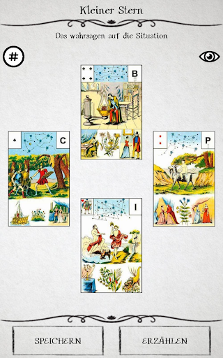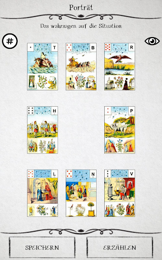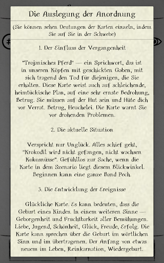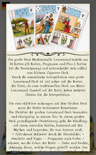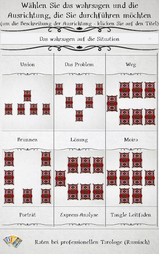 Die Technik des Wahrsagens in unserer Anwendung ist absolut identisch mit dem Kartenlegen in der realen Kabine. Der Prozess der Wahrsagerei und das Ergebnis hängt allein von Ihnen und niemanden mehr. Der Abruf der Karten erfolgt nach den Regeln des Layouts Maria Lenormand. Dadurch erweist sich das Ergebnis der Weissagung sehr genau.