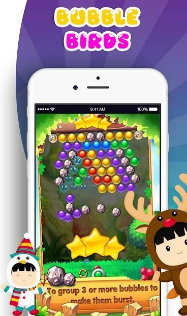 - To group 3 or more bubbles to make them burst and free the birds.