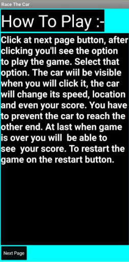 Klicken Sie auf die Schaltfläche Nächstes Seiten, nachdem Sie auf klicken, sehen Sie die Option, das Spiel zu spielen.Wählen Sie diese Option aus.Das Auto wird sichtbar, wenn Sie darauf klicken, das Auto ändert seine Geschwindigkeit, den Standort und sogar Ihre Punktzahl.Sie müssen verhindern, dass das Auto das andere Ende erreicht.Wenn das Spiel vorbei ist, können Sie Ihre Punktzahl sehen.Um das Spiel auf der Schaltfläche Neustart neu zu starten.