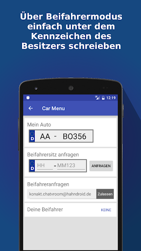 • Du solltest natürlich nicht während dem Fahren schreiben! Deswegen gibt es einen Beifahrermodus, mit dem du Mitfahrern erlauben kannst unter deinem Kennzeichen zu schreiben!