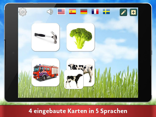 Das Spiel kommt mit 4 hochwertigen integrierten Spielkarten, um Ihnen den Einstieg (Fahrzeuge, Werkzeuge, Obst und Gemüse, und Tiere), mit Ton in 5 verschiedenen Sprachen (Englisch, Spanisch, Deutsch, Französisch und Schwedisch) lokalisiert. Der reale Wert der MyMemo liegt jedoch in der Bildungsmöglichkeiten, indem Sie eigene Spielkarten macht. Beispielsweise: