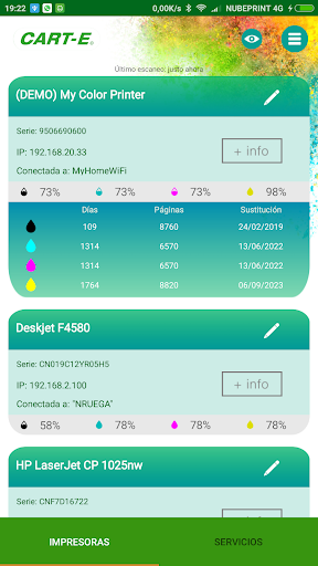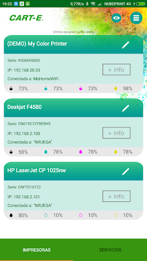 Una vez instalada, la app descubre las impresoras de la red a la que esté conectado y le muestra en cuestión de segundos el estado de dichas impresoras. Incluso si se encuentra en la calle, puede consultar el estado de sus impresoras.
