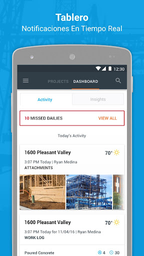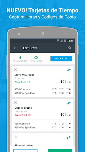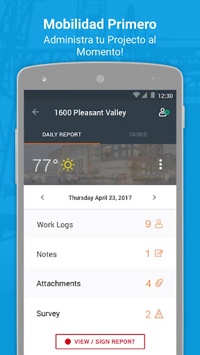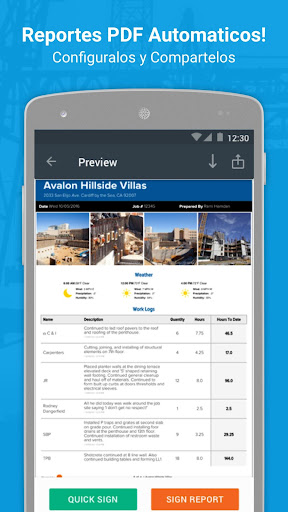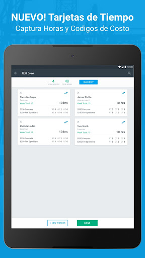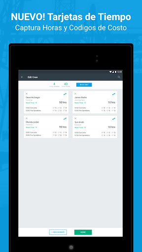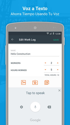 Trabajadores como Superintendentes, Supervisores de Obra, Gerentes de Proyecto y Inspectores de Construcción pueden escribir o dictar información directamente desde el teléfono o tableta mientras estén en la obra. Agregue y divida las horas de los empleos y cuadrillas, capture y actualice códigos de costes en segundos, y envíelo automáticamente a la oficina para generar una nómina de costes. Directores de proyecto, estimadores y dueños pueden ver el progreso de horas presupuestadas para mantener su proyecto debajo del presupuesto. Añada fotos, vídeos y archivos adjuntos a su reporte. Al final del día… ¡envíelo desde su teléfono o tableta!
