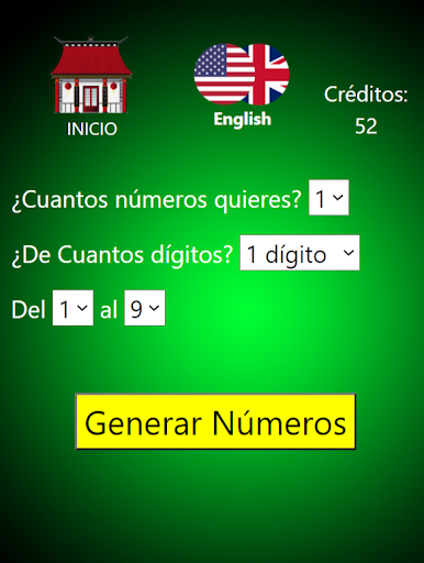 La aplicación dispone de un menu que nos permite obtener números de 1 dígito, 2 dígitos haste 3 dígitos y luegos números de 5 dígitos para