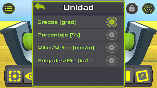 La aplicación tiene la función para elegir el tipo de unidad de despliegue, permitiendo mostrar en grados, porcentaje, milímetros/metro y pulgadas/pie , según se requiera.