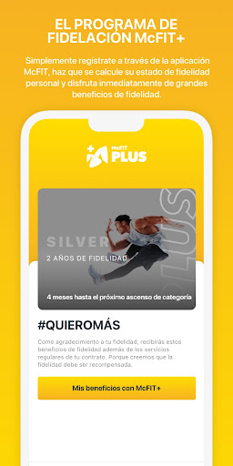 La aplicación es también tu entrada al McFIT , el exclusivo programa de fidelización de McFIT. Sólo tienes que registrarte a través de la aplicación McFIT y calcular tu grado de fidelidad personal.Dependiendo del tiempo que lleves afiliado a McFIT, podrás disfrutar de ventajas adicionales exclusivas como socio de bronce, plata, oro, platino o diamante, que podrás canjear individualmente.Puedes traer, por ejemplo, a tus amigos a entrenar contigo de forma gratuita. Cuanto más tiempo estés con nosotros, más ventajas tendrás. Porque creemos que la lealtad debe ser recompensada.