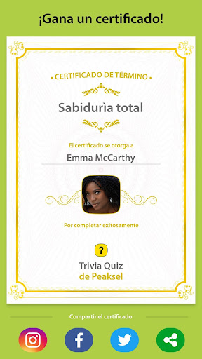 - Certificado: lo obtienes cuando contestes todas las preguntas de trivia de conocimiento