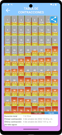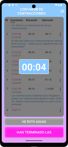 Este es el temporizador/contador de contracciones fácil de usar. La aplicación ayuda a realizar un seguimiento de sus contracciones y determinar cuándo es el momento de ir al hospital.
