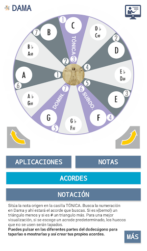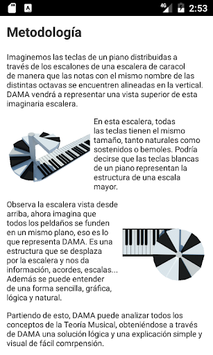 A través de DAMA no sólo podrás obtener información de una manera directa (transporte de acordes, melodías, obtención de tonalidades, formación de acordes, etc.). Además podrás comprender de una forma visual y gráfica muy sencilla el por qué y la lógica de estas formaciones, resultando DAMA una herramienta imprescindible a la hora de comprender la teoría musical desde sus conceptos más básicos hasta las estructuras más complejas.