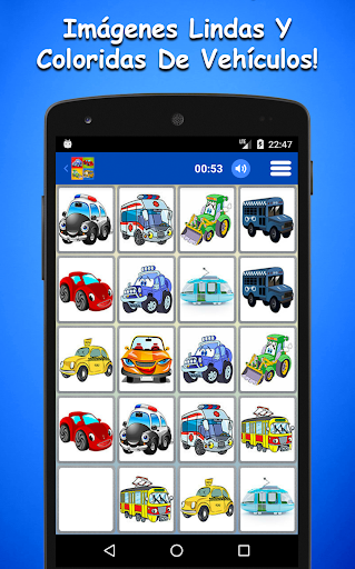 * El Juego De Memoria De Vehículos Para Niños tiene una interfaz simple e intuitiva que es fácil para usar y jugar. Ste juego de memoria gratuito también es apto para tablets y mantendrá a tus hijos tranquilos y entretenidos en el auto, en el restaurante y en cualquier lugar.