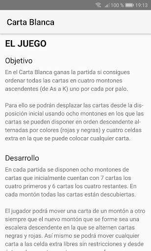 - En el Carta Blanca se gana si se consigue ordenar todas las cartas en cuatro montones ascendentes, uno por cada palo