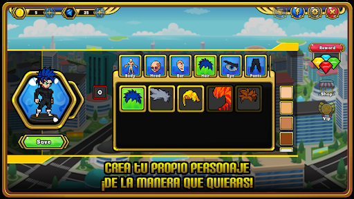 ¡Usa tu imaginación y crea un personaje como quieras! ¡Combina los elementos y muestra a todos lo increíble que es tu personaje! ¡Modifica ropa, habilidades, espadas, hachas, poderes, combos y más! ¡Crea guerreros, dragones mascotas, Z shinigamis, ninjas shinobi, superhéroes, piratas y otros personajes basados en el anime!