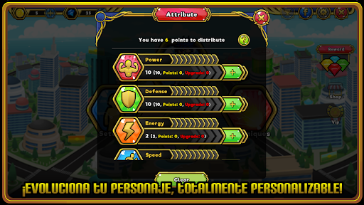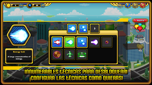 ¡Impulsa a tus guerreros legendarios con poderes como bolas de energía, bolas de fuego, kunai rápidos, estrellas ninja, ondas de energía, ataques de chakra, ataques Z, ataques elementales, ataques cosmos y más!