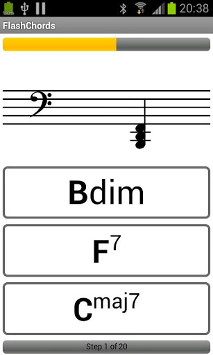 Flash Chords shows you a chord in musical notation using a bass clef and three possible names for the chord. You pick the correct name.
