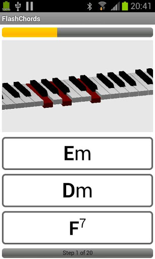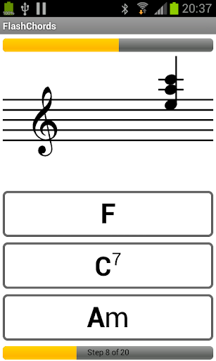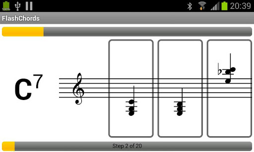 The App shows the key signature for the following chords for a period of five seconds and then starts a sequence of 20 chords. These 20 chords all use the same key signature.