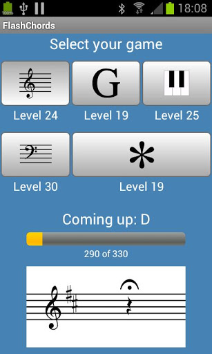 Flash Chords shows you the name of a chord, and three possible versions in musical notation using a treble clef. You pick the correct musical notation.