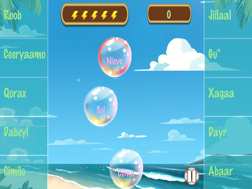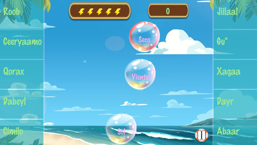 Aprende el somalí como lenguaje de la manera más sencilla que puedas pensar. Pero necesitas hacerte con un buen vocabulario y ello puede ser agotador. Si estás viajando a Somalia o solo quieres aprender este hermoso lenguaje, este aplicativo es para ti. Es un adictivo juego de vocabulario, eliges las nuevas palabras y frases somalíes solo tocando las burbujas y dejando que floten en tu pantalla. Cada burbuja tiene una palabra o frase en somalí pudiendo incluso oír la palabra narrada por un parlante nativo. Presionas la burbuja y luego la traducción para así acertar y romper la burbuja. Los primeros niveles son sencillos y mientras los avanzas estarás adivinando (ya que aún estarás aprendiendo). El primer nivel te otorga un 50% de probabilidades de elegir la opción correcta. El segundo nivel te otorga un 25% de probabilidades. Pero después de ello, deberás demostrar lo que sabes de los dos primeros niveles. En algunos otros niveles, no habrá textos (solo archivos audibles narrados por un nativo parlante), mientras que en otros no tendrás archivos audibles pero si contarás con las palabras en texto para proseguir y realizar a su vez la traducción adecuada. Al final de cada categoría tendrás esas palabras en tu poder y estarás paralelamente adquiriendo tu boleto aéreo a Mogadishu. El Baño de Burbujas Somalí contiene 63 categorías del lenguaje (y más de 600 palabras y frases de vocabulario), escritas o narradas por un somalí parlante nativo.