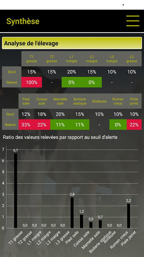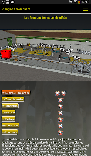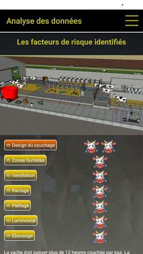 Ce sont ainsi les facteurs de risque, exprimés par les animaux, qui concernent les risques de mammites, de boiteries, de déficit énergétique, de troubles de la reproduction et de troubles de la production qui sont explorés précisément, l’expertise est assurée par le logiciel et rapidement, moins de 15 minutes sont nécessaires pour évaluer 20% du troupeau qui constituent un échantillon représentatif.