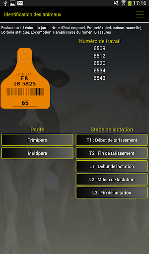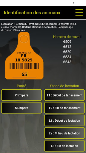 Ceux-ci peuvent être identifiés par leur numéro officiel ou uniquement avec l’indication de leur parité (Primipares-Multipares) et par leur stade physiologique, pour les laitières : (Début de tarissement – Fin de Tarissement – Début de lactation (2mois) ) - Milieu de lactation (3 mois) – fin de Lactation (du 5ième mois au Tarissement) et pour les allaitantes (Fin de Gestation – Début d’Allaitement – milieu de Gestation).