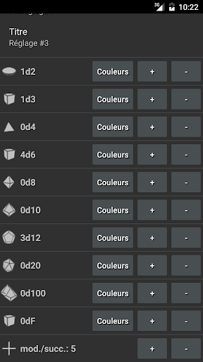* Version PRO: 20 préréglages, ignorer/conserver, rerouler/ajouter, texte pour le dés, personnaliser le Dé Special (dS), autre seuils de succès