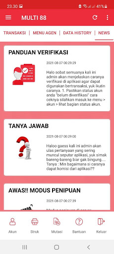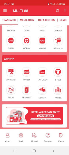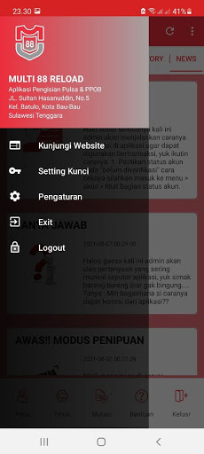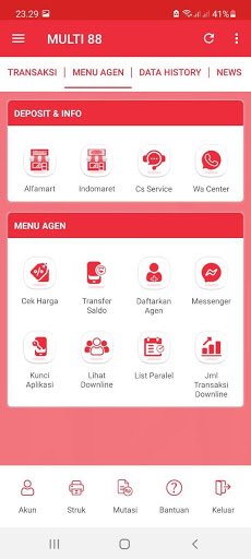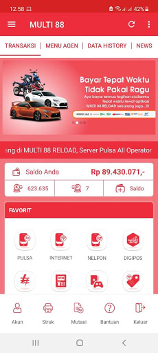 Multi 88 Android Application est une application mobile gratuite pour les fidèles Multi 88 membres où qu'ils soient. Cette application vous permet de faire diverses transactions telles que la charge complémentaire, l'achat de jetons électriques, des paiements de factures postpayés, des bons de jeu d'achat, etc. avec cette application, vous pouvez facilement vérifier les derniers prix d'impulsions, voir Récape Sur l'historique des transactions, l'historique change votre solde, votre activité de réseau de descendance, chatter avec le service à la clientèle, etc.