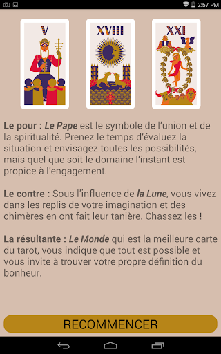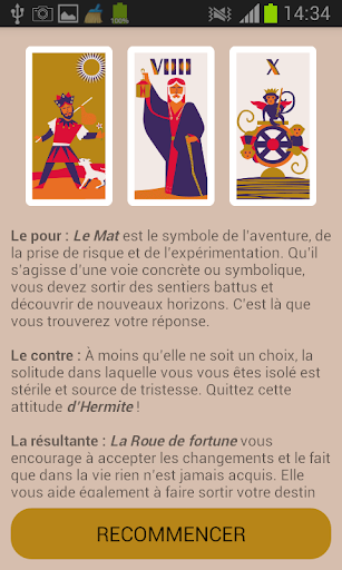 Pour recevoir un conseil lucide et sage, il vous suffit de vous concentrer et de tirer trois cartes. Si la réponse ne vous paraît pas suffisamment claire, reformulez votre question et procédez à un second tirage,