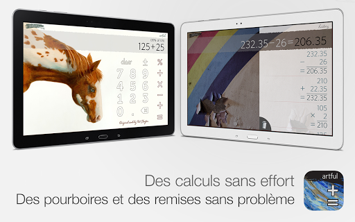 Je me présente : Calculatrice Artful, la plus belle de toutes les calculatrices. Dotée d’œuvres d’art du monde entier, j’éclaire votre journée à chaque fois que vous avez besoin de faire un calcul. Je fonctionne avec Calculatrice Plus, la calculatrice des petits calculs de tous les jours la plus utilisée internationalement et figurant parmi les « 25 Essential Apps » du classement de USA Today.